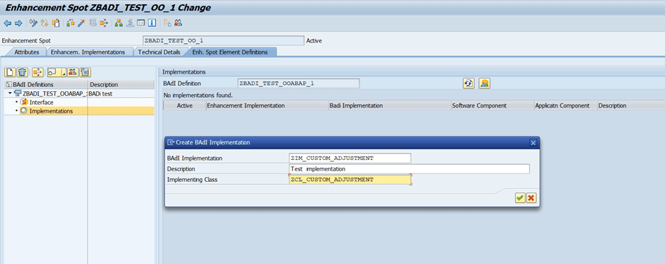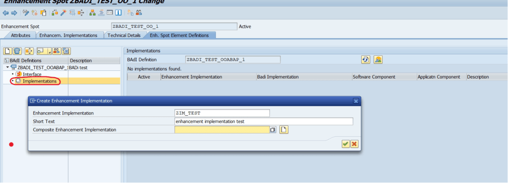 5. Once the interface is created go back to the enhancement spot and click on implementations and create a enhancement implementation by provide a suitable name and short description